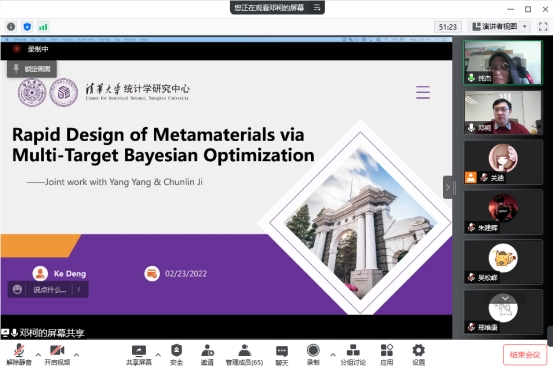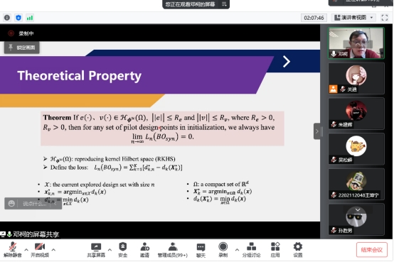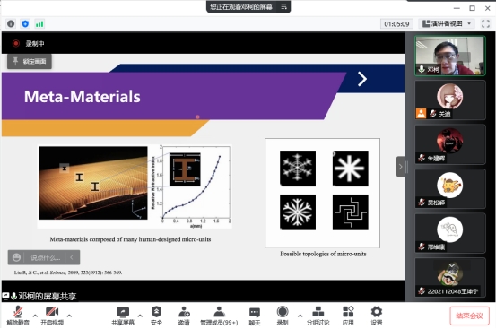 会议过程中,邓教授以介绍超材料的物理特性为背景,讲解如何用计算机在空间下利用微元思想模拟超材料结构的方法,通过精心设计的折射场使得光照或其他情况下实现特殊的物理特性。邓教授通过数学和统计方法把连续的折射场进行离散化,改造微元使得超材料能在既定的条件下有可观测的变化。该项目的意义和应用场景十分广泛,例如在航空航天场景下,卫星的圆弧形信号接收板可以通过上述手段改进成平板形状,从而可以缩小卫星的体积和重量等重要属性。