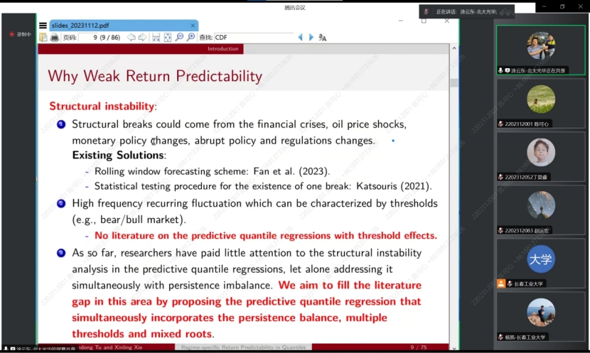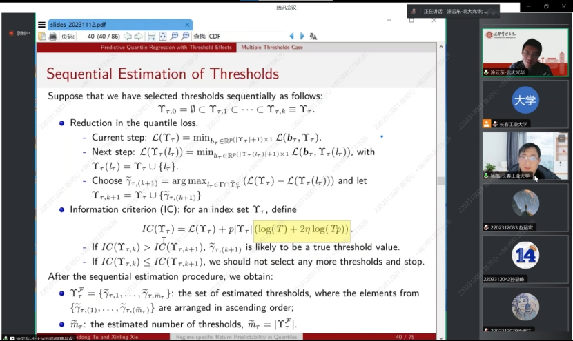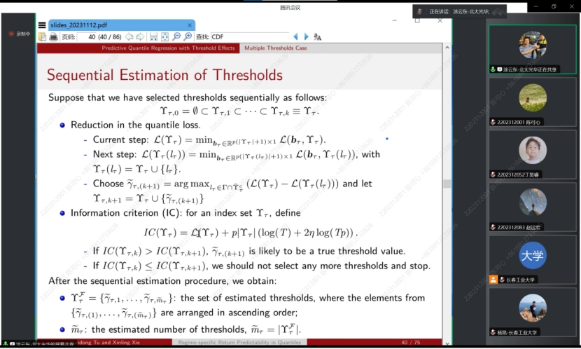 涂云东教授在本次研究中,提出了一种具有多阈值的分位数回归预测算法,以捕捉股票收益预测中潜在的区制转换机制。涂教授从平均回归预测开始讲起,详细了讲述了平均回归预测的理论和公式,然后引入分位数回归预测基础理论,并且详细解释了为什么收益的可预测性较弱等问题。